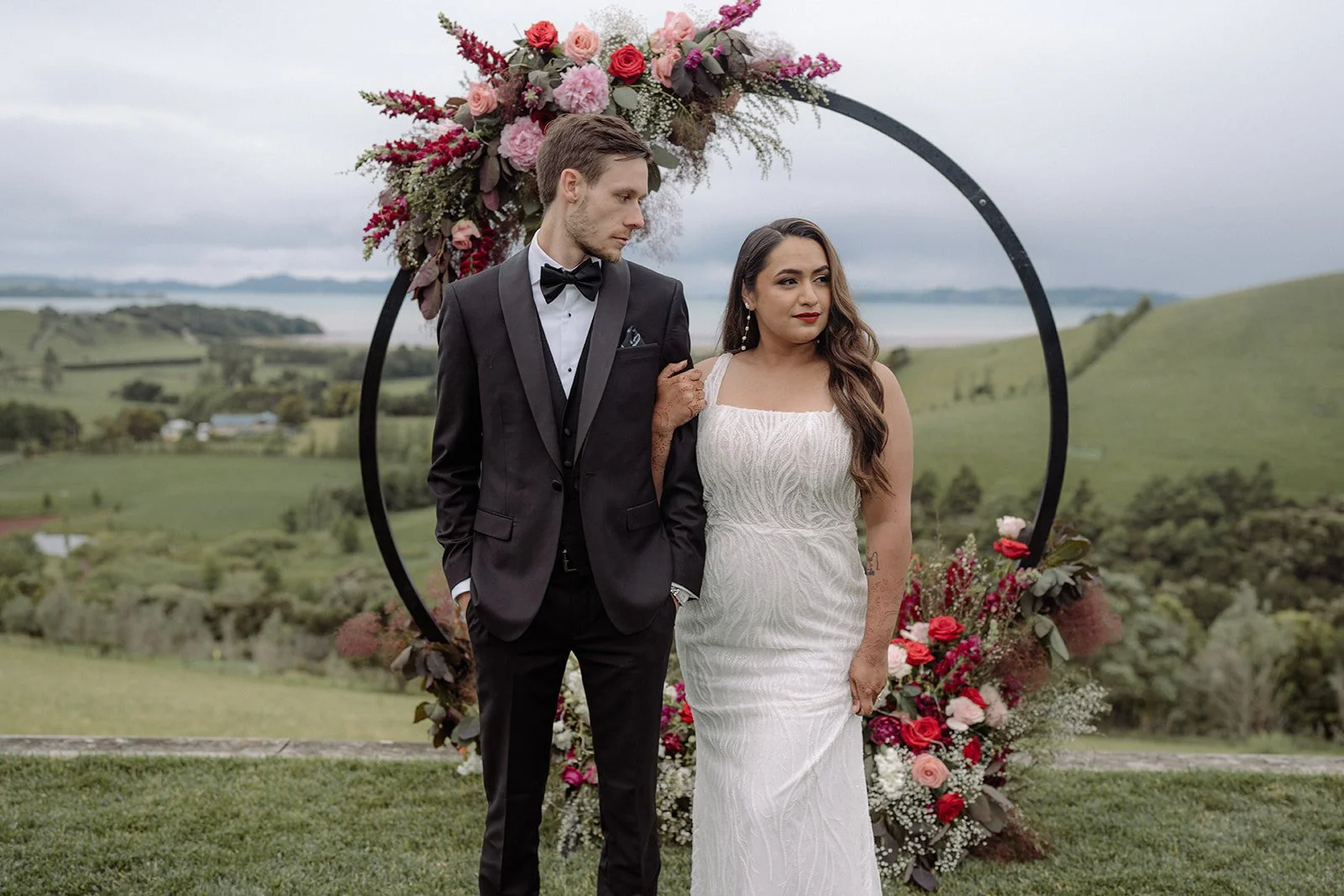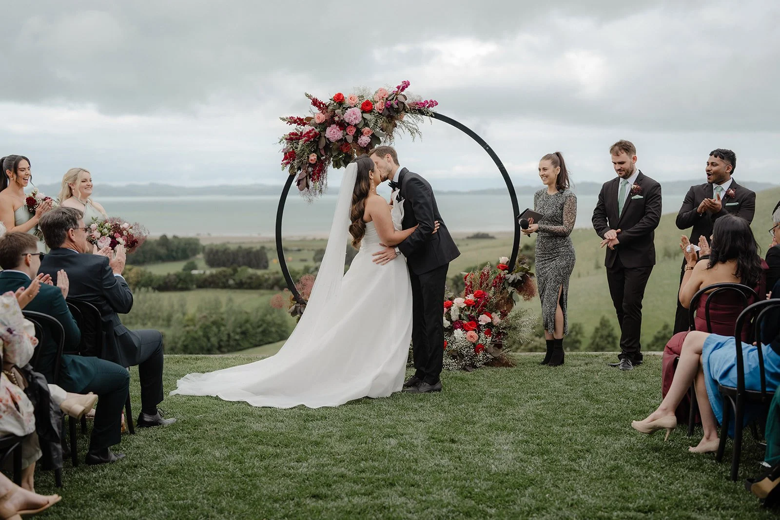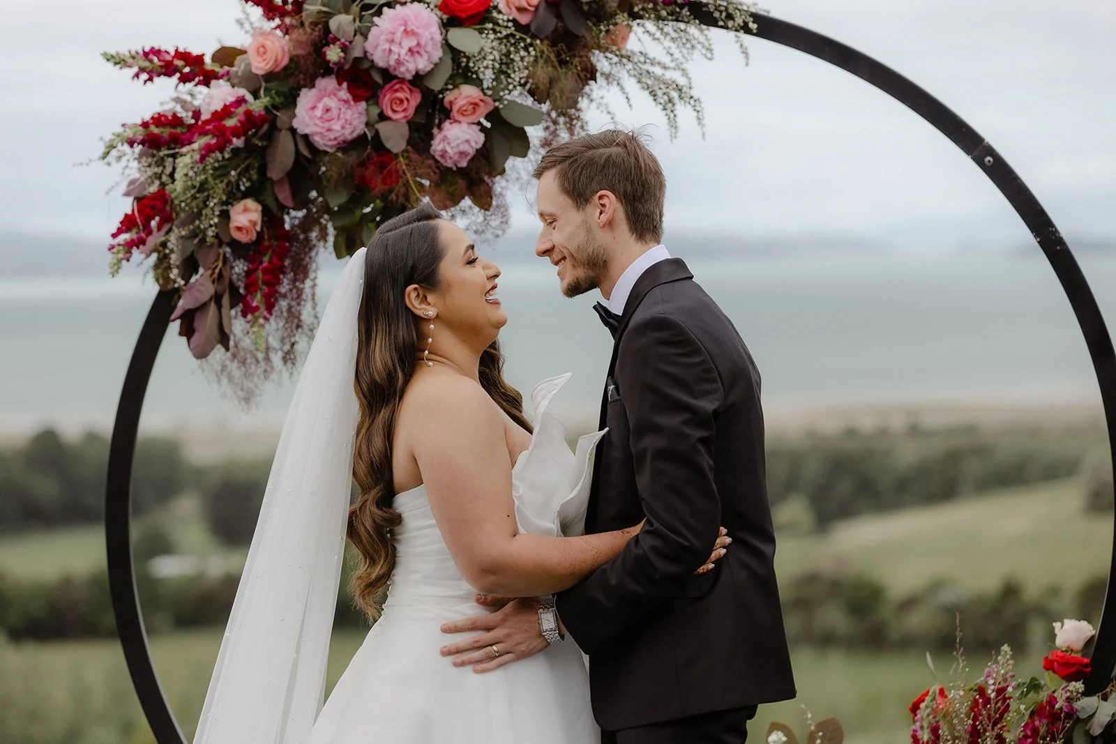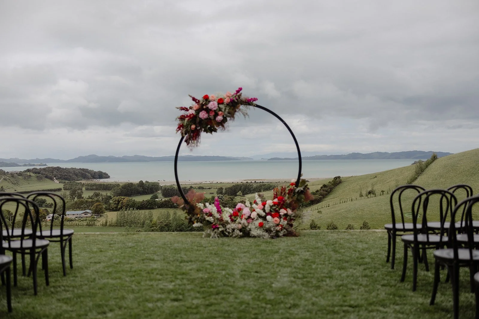 Astha and Scott had a double cultural wedding with their Indian wedding on the Thursday at Markovina and their Western wedding at Kauri Bay on the Saturday. These two were organised, fun, delightful and absolutely trusting of our work. Early on in the planning Astha told me “As long as the colours were right and the elements were in the correct locations she was happy for us to get creative”. Scott’s one wish was to have a circular arch. The hanging installation and garlands in the lodge made the venue feel festive and intimate and when the beautiful couple arrived Astha burst into happy tears which absolutely made our day