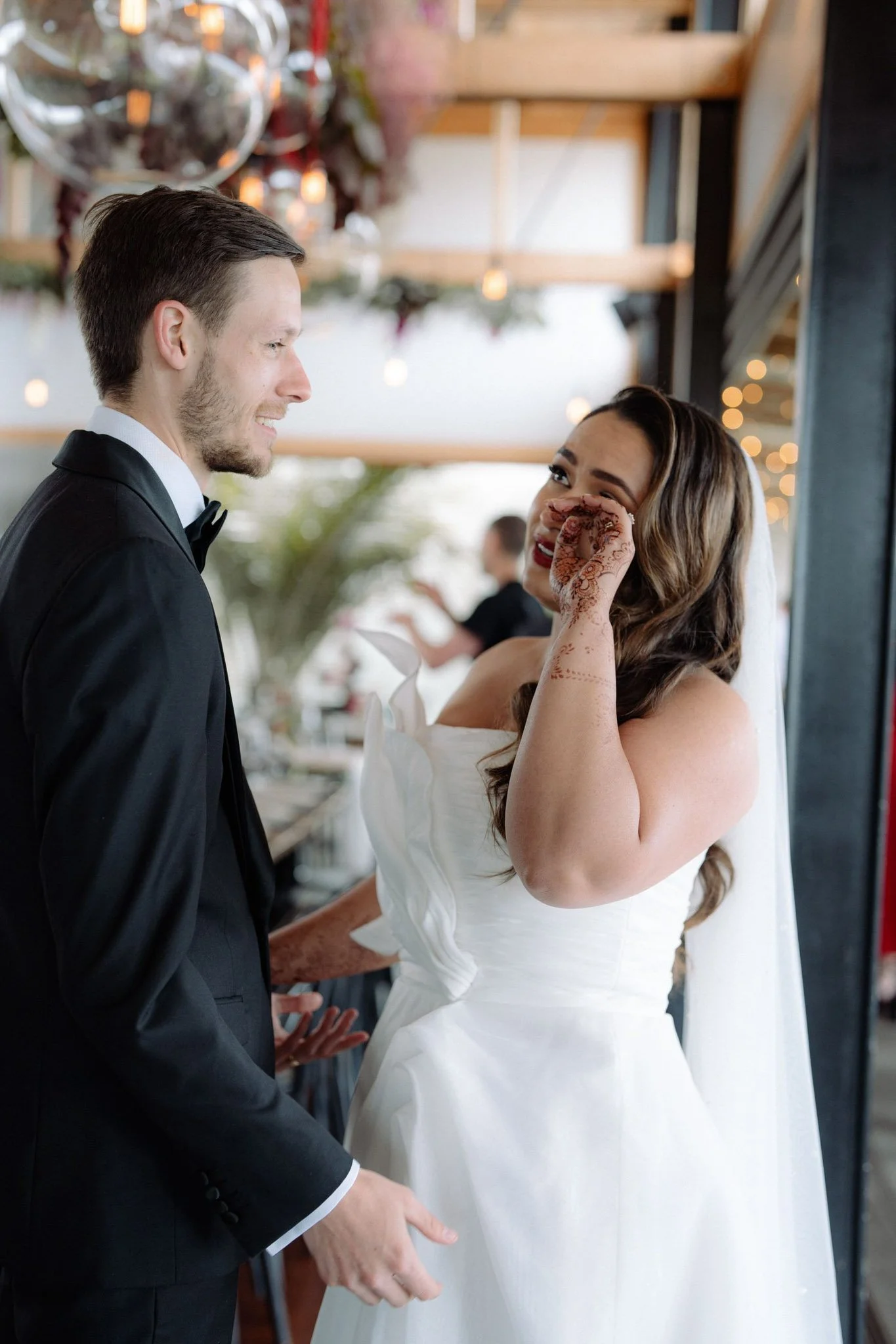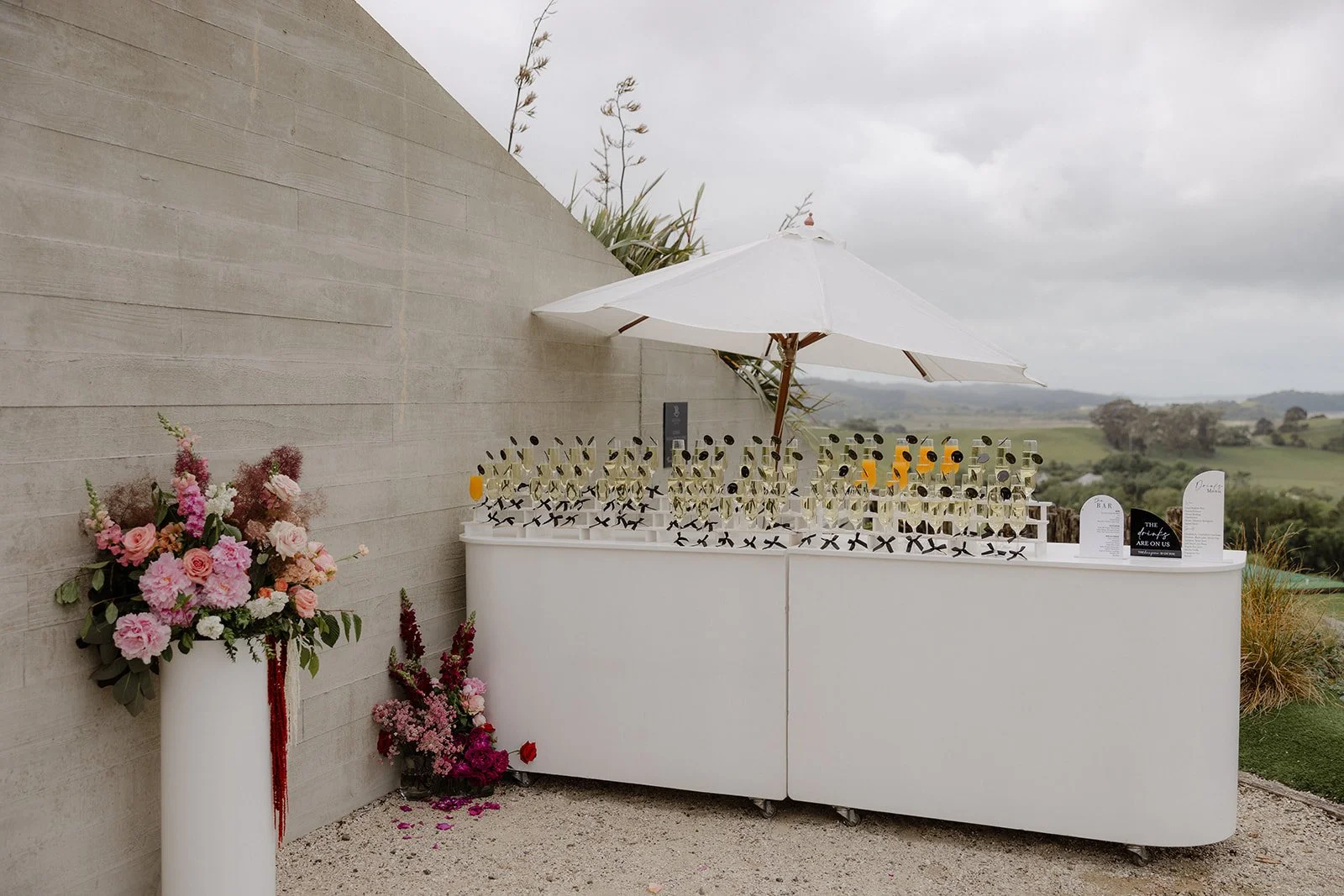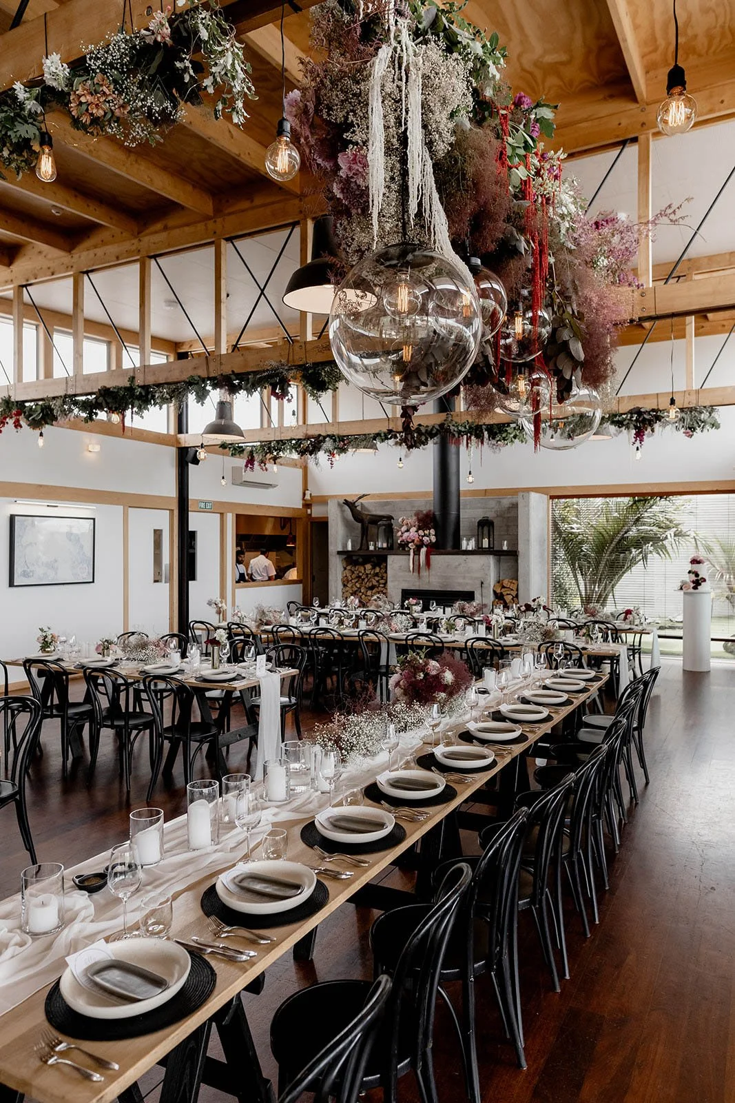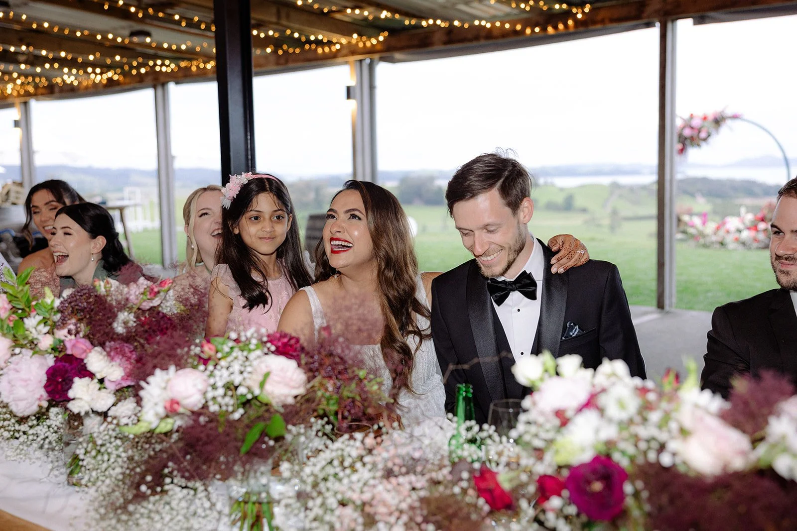 Astha and Scott had a double cultural wedding with their Indian wedding on the Thursday at Markovina and their Western wedding at Kauri Bay on the Saturday. These two were organised, fun, delightful and absolutely trusting of our work. Early on in the planning Astha told me “As long as the colours were right and the elements were in the correct locations she was happy for us to get creative”. Scott’s one wish was to have a circular arch. The hanging installation and garlands in the lodge made the venue feel festive and intimate and when the beautiful couple arrived Astha burst into happy tears which absolutely made our day